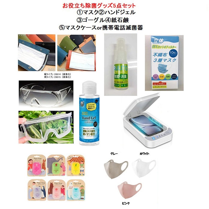 除菌グッズ マスク マスクケース ハンドジェル ゴーグル 紙石鹸 携帯電話滅菌器 5点セット 感染予防 ウイルス対策 子供 大人 ...