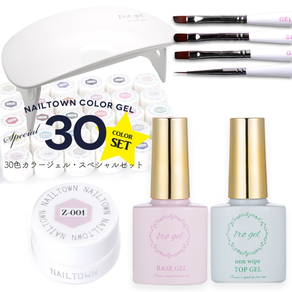 【ネコポス送料無料】ネイルタウンジェルスペシャル30色セット ベース・トップジェル・ジェルブラシ4本+LEDライト付き