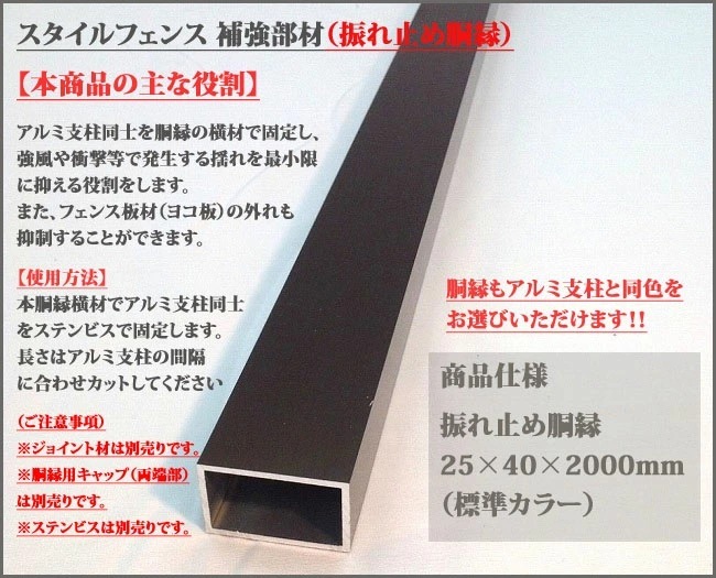 スタイルフェンス アルミ支柱 補強部材【商品名:振れ止め胴縁(補強部材)/サイズ:25×40×2000mm/1本/標準カラー用】単...