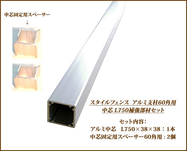 【スタイルフェンス アルミ支柱補強部材】スタイルフェンス アルミ支柱60角用 補強部材【商品名:中芯L750用セット】アルミ中芯:...