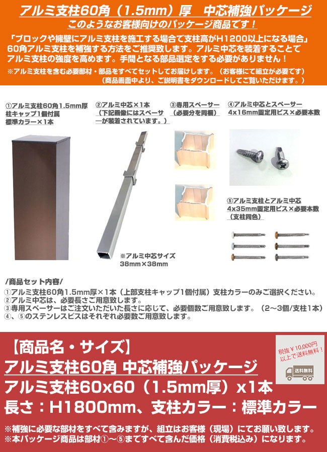 【目隠しフェンス スタイルフェンス用】アルミ支柱60角補強部材 商品名:アルミ支柱60角 1.5mm厚/中芯補強パッケージ H18...