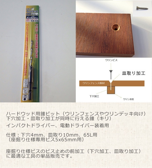 【ハードウッド用皿取錐ビット】仕様:下穴4mm、皿取り10mm、65L用(座掘り仕様専用ビス5x65mm用)下穴加工・皿取り加工が...