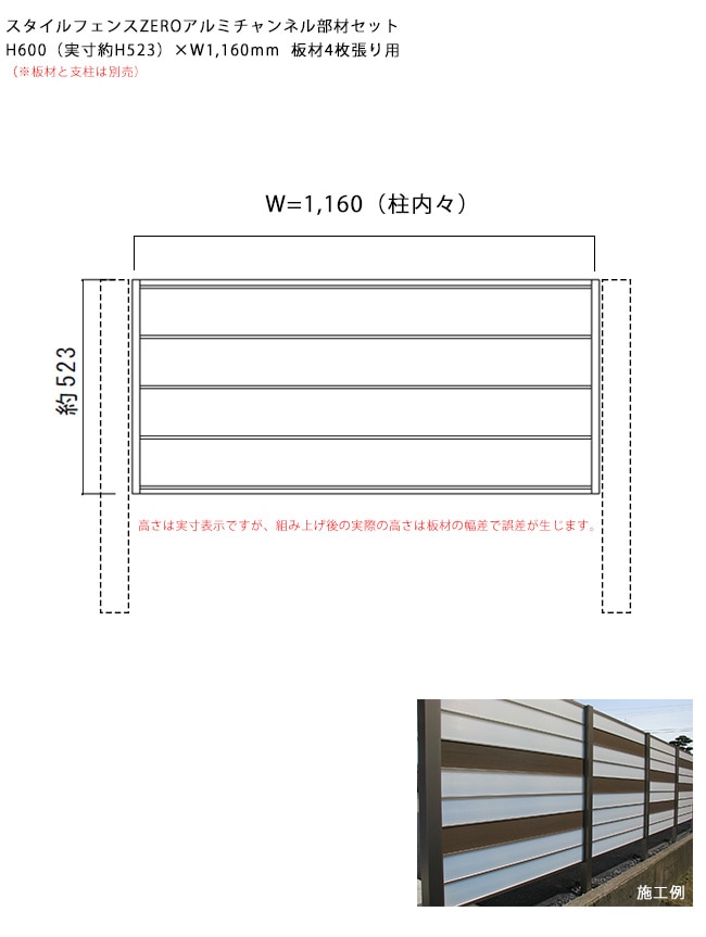 商品名:スタイルフェンスZEROアルミチャンネル部材セット1スパン:H600(実寸約H523)×W1,160(mm)板材4枚張り用...