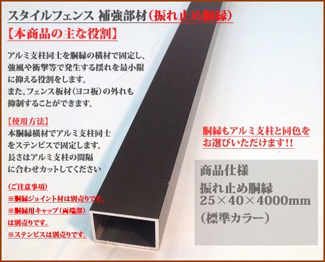 スタイルフェンス アルミ支柱 補強部材【商品名:振れ止め胴縁(補強部材)/サイズ:25×40×4000mm/1本/標準カラー用】単...