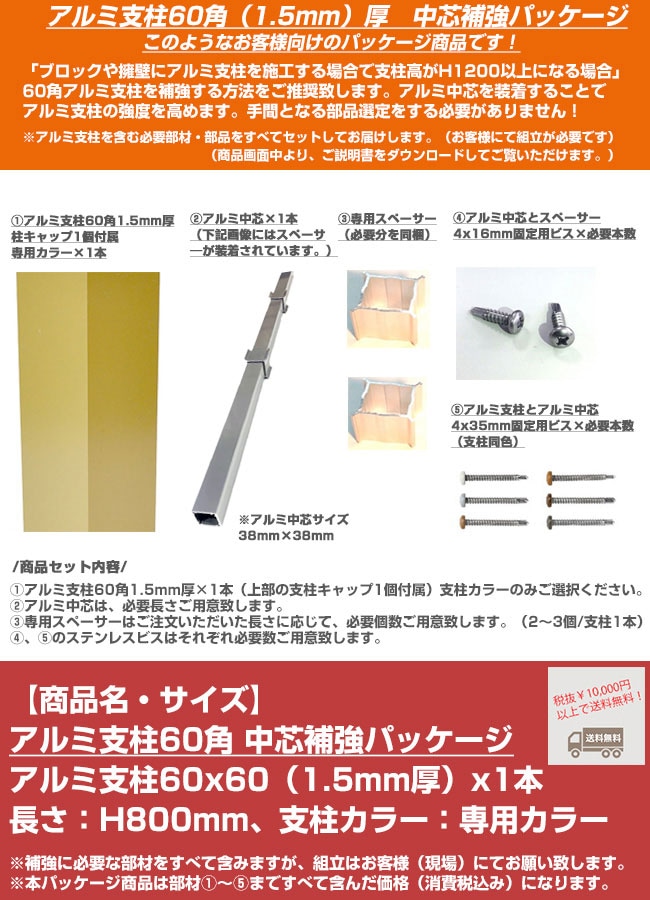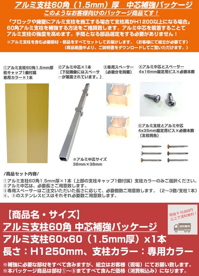 【目隠しフェンス スタイルフェンス用】アルミ支柱60角補強部材 商品名:アルミ支柱60角 1.5mm厚/中芯補強パッケージ H10...