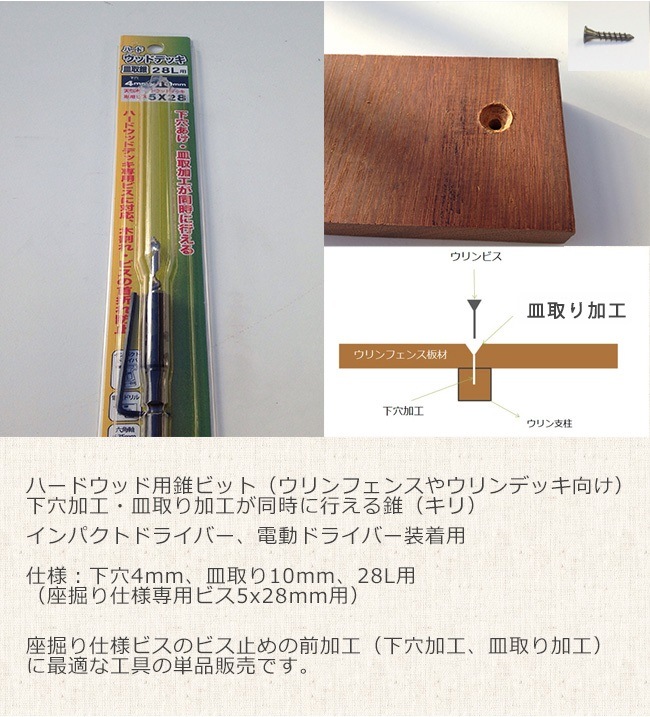 【ハードウッド用皿取錐ビット】仕様:下穴4mm、皿取り10mm、28L用(座掘り仕様専用ビス5x28mm用)下穴加工・皿取り加工が...