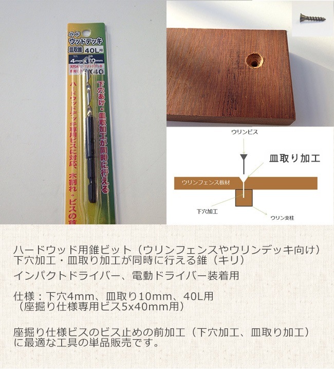 【ハードウッド用皿取錐ビット】仕様:下穴4mm、皿取り10mm、40L用(座掘り仕様専用ビス5x40mm用)下穴加工・皿取り加工が...