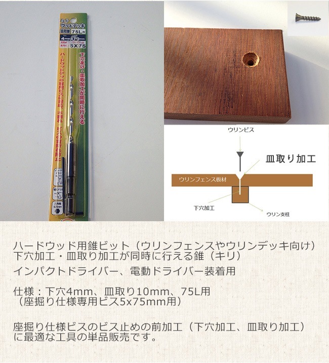 【ハードウッド用皿取錐ビット】仕様:下穴4mm、皿取り10mm、75L用(座掘り仕様専用ビス5x75mm用)下穴加工・皿取り加工が...