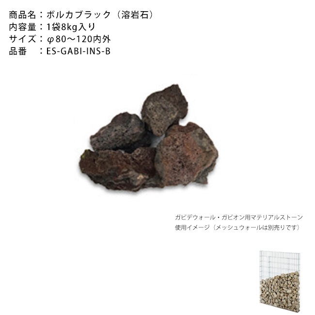 【マテリアルストーン】ボルカブラック1袋約8kg入り/サイズ:φ80~120内外、色:黒、素材:溶岩石、品番:ES-GABI-IN...