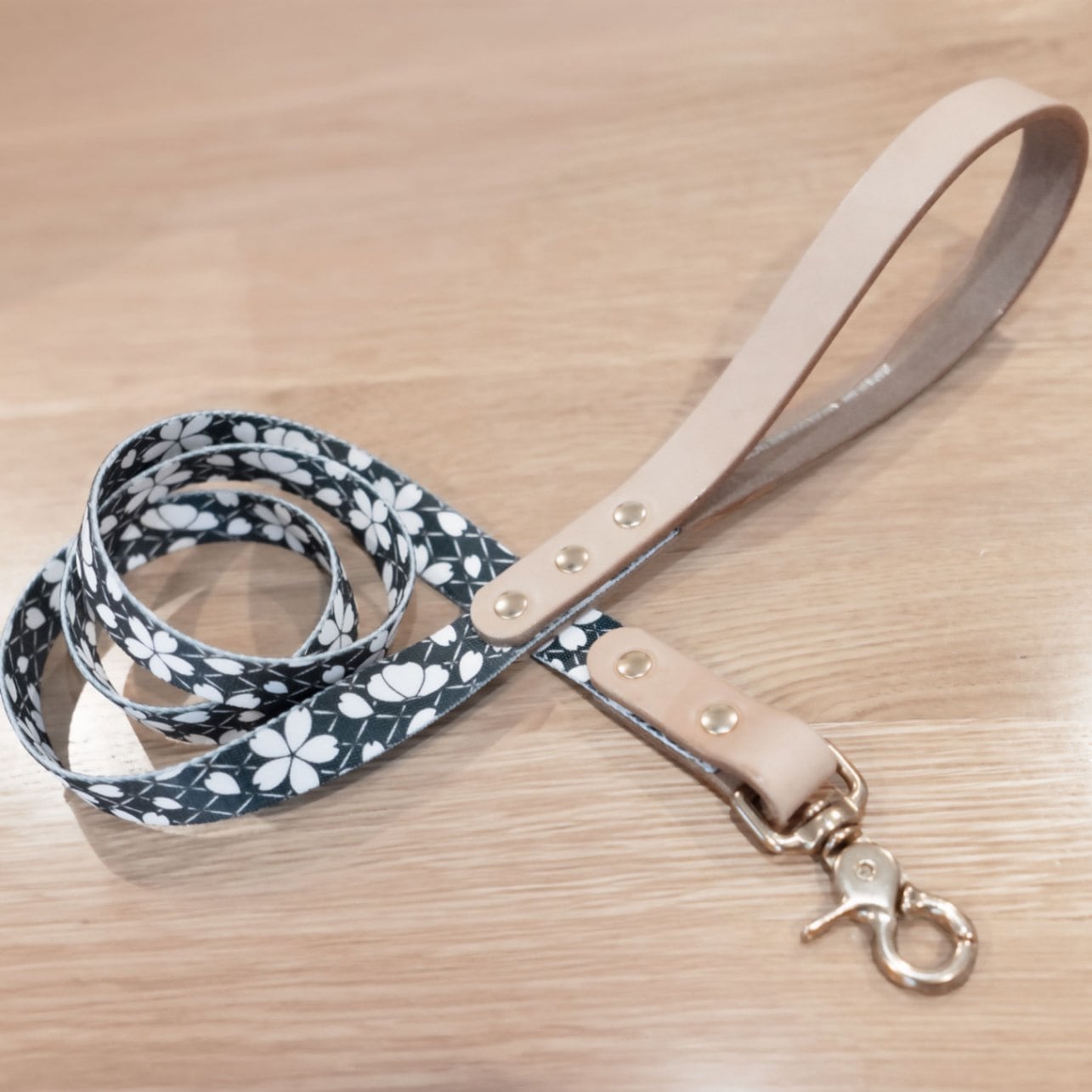 サクラ模様リード 真鍮製ナスカン 小・中・大型犬用16/24mm幅 持ち手ヌメ革 A2681