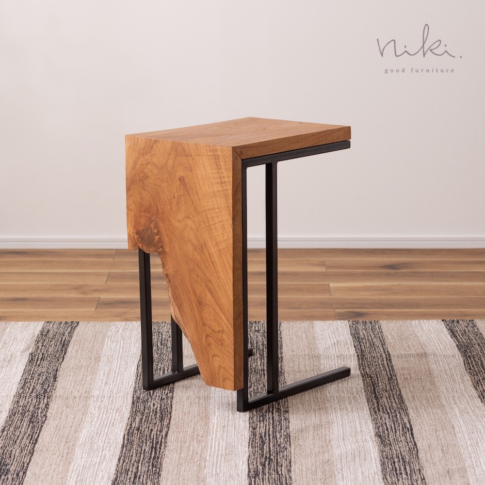 チーク材の木目そのものの形状を活かしたフォルムのおしゃれなサイドテーブル
