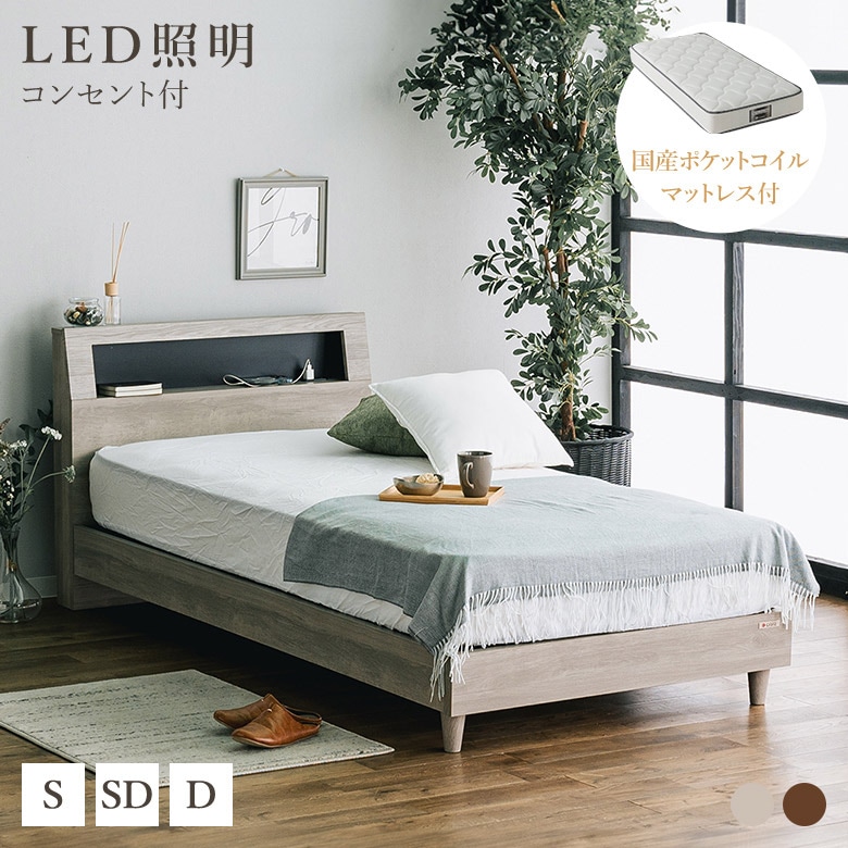 ベッド マットレス付き グレージュ ベッドフレーム 国産ポケットコイル マット付き LED照明棚&コンセント シングル / セミ...