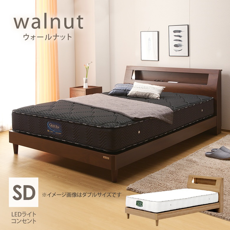 ウォールナット セミダブルベッド ウォルテ ブラウン 棚付き コンセント付き【省エネタイプのLED照明】 引出し無し