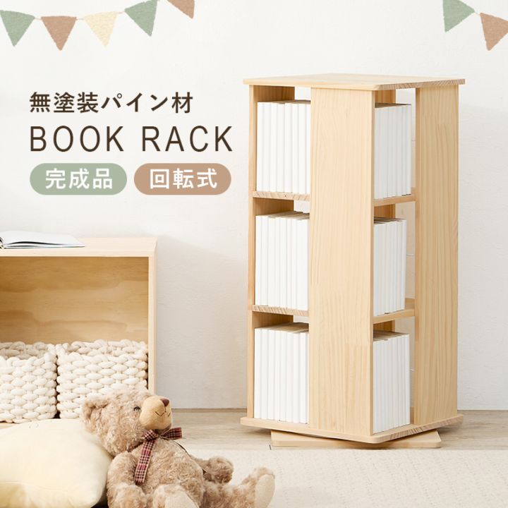 本棚 回転式 大容量 角型 3段 省スペース 収納 完成品 無塗装