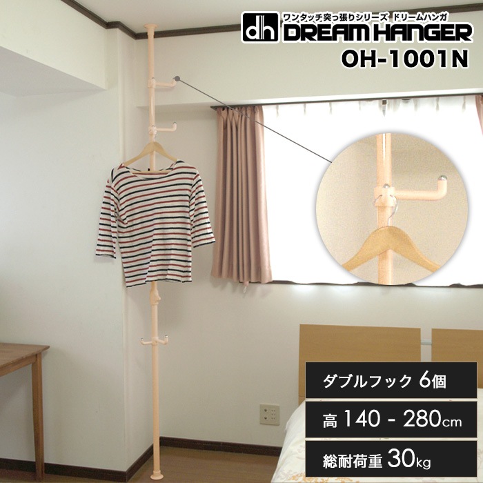 【簡単】ワンタッチ式突っ張りポールハンガー 高さ140cm-280cm 総耐荷重30kg ダブルフック6個 ドリームハンガー OH...