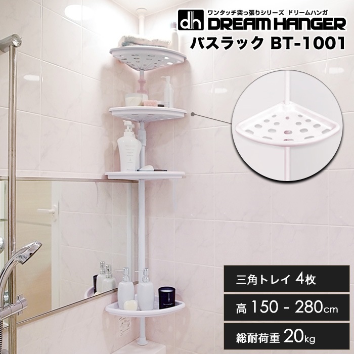 【在庫限り】【簡単】ワンタッチ式突っ張りポールハンガー バスラック トレイ付 高さ150cm-280cm 総耐荷重20kg ドリー...