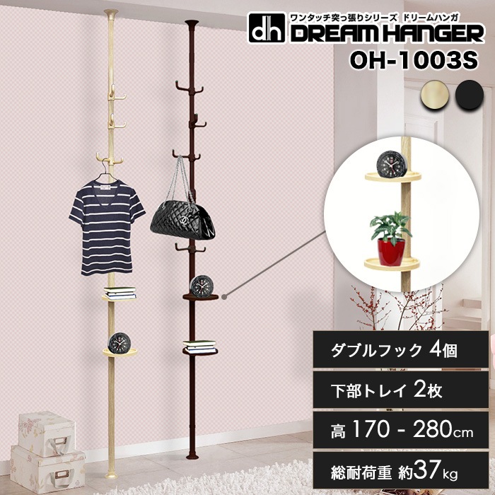 【簡単】ワンタッチ式突っ張りポールハンガー トレイ付 高さ170cm-280cm 総耐荷重37kg フック4個 ドリームハンガー ...