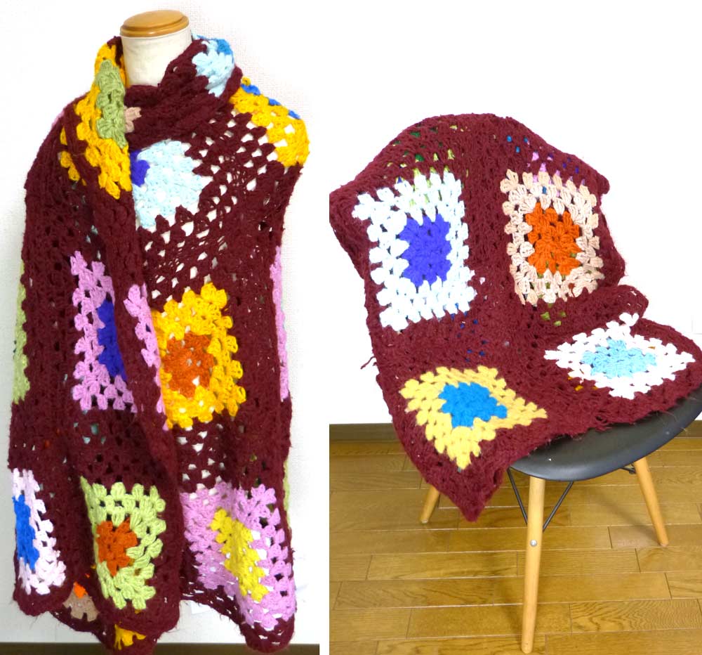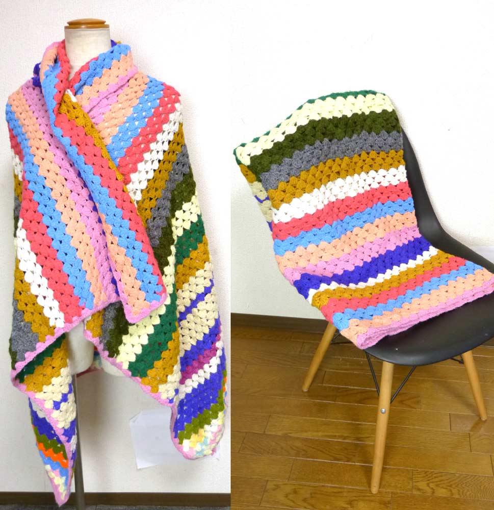 USA 1970sレトロ モチーフ編ハンドメイド ブランケット / ニットブランケット 手編み(162×110cm)【中古】