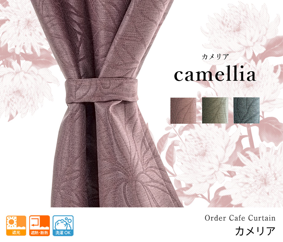 エレガントなエンボス加工を施したボタニカル柄の1級遮光カフェカーテン「カメリア」バーガンディー