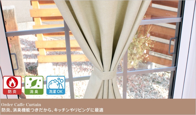 ざっくりとした質感が特徴の消臭機能付き防炎無地カフェカーテン(グリーン)