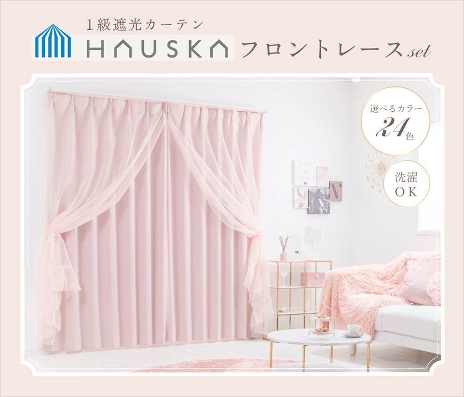 遮光率99.99% 選べる24色 無地の防炎1級遮光カーテン「HAUSKA」+オーガンジーレースカーテン「グレース」フロントレース...