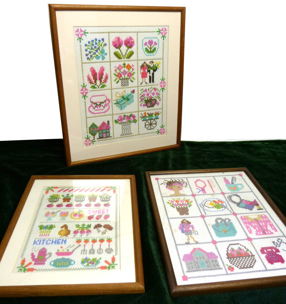 木製額縁 バンコク タイ製 刺繍壁掛け(キッチン・フラワーモチーフ)額装 / 3枚セット【中古】