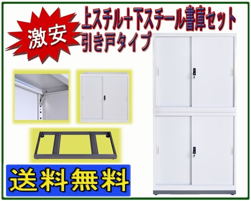書庫セット 上スチール+下スチール引き違い書庫セット品 スチール書庫 スチールキャビネット 引き戸タイプ ベース付き 書類保管庫 ...