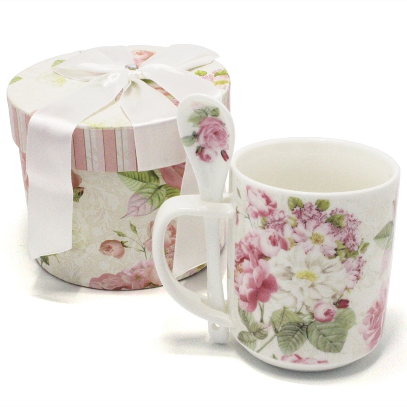 マグカップ (ピンク&ホワイトローズ) ティースプーン付き ギフトボックス入り