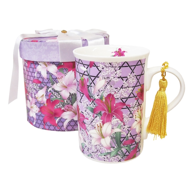 彩雅 マグカップ (百合×パープル) 金のふさ付き ギフトボックス入り