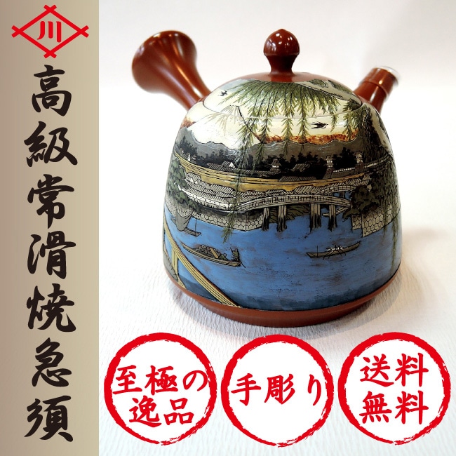 特選常滑焼 伝統工芸士「雪堂」作「壺堂」彫 八つ見の橋(夏)