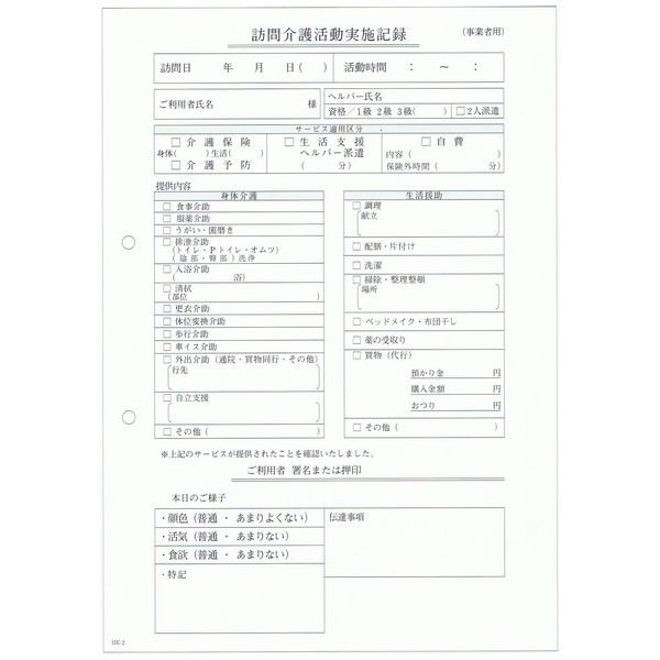 訪問介護伝票 訪問介護活動実施記録 HK-2 2枚複写 50組×10冊【取り寄せ商品・即納不可】
