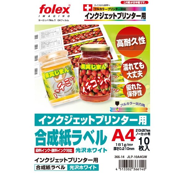 インクジェットプリンター用 合成紙ラベル 光沢ホワイト A4 10枚入 フォーレックスJLP-10A4GW