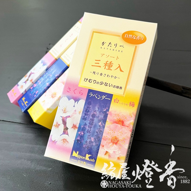 お線香『自然の香り・かたりべ 【三種入】短寸バラ詰・天然精油配合[微煙]』日本香堂