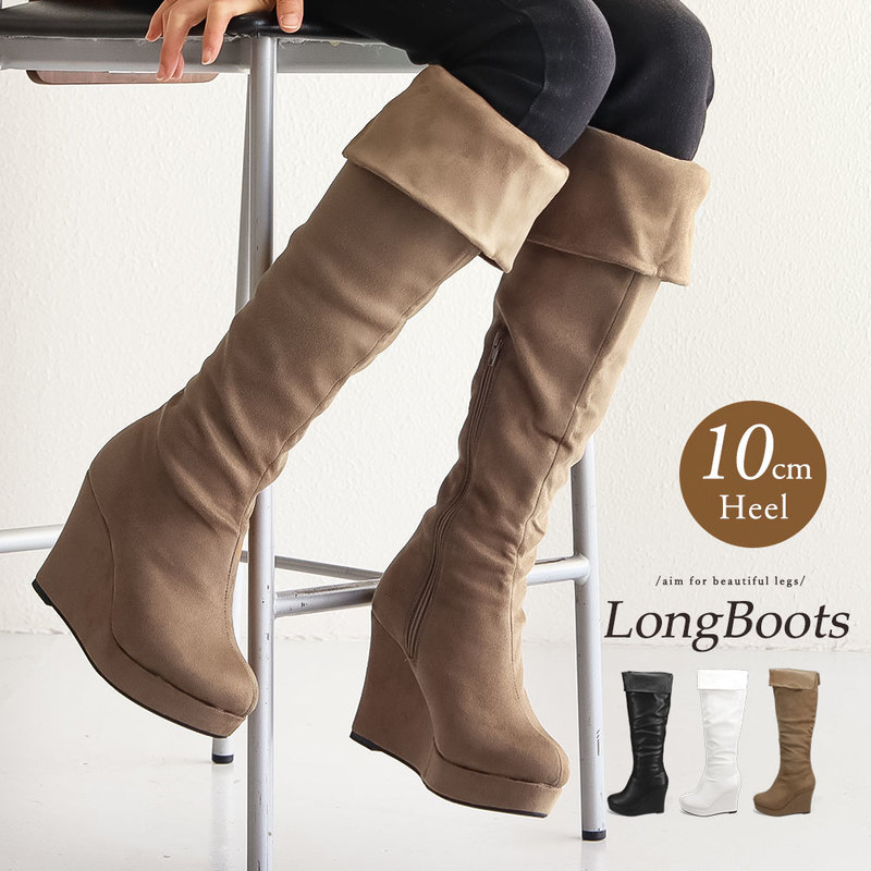 ロングブーツ ストレッチブーツ レディース ヒール アーモンドトゥ サイドジップ チューブブーツ ウェッジソール ハイヒール 上品...