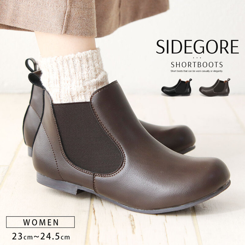 サイドゴアブーツ レディース 3E ショート ブーツ ローヒール ぺたんこ 幅広 チェルシーブーツ 靴 ハッシュドコーデ 黒 ダー...