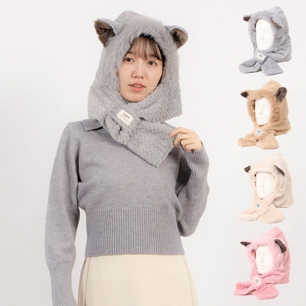 キツネ耳付きフード一体型ニットマフラー