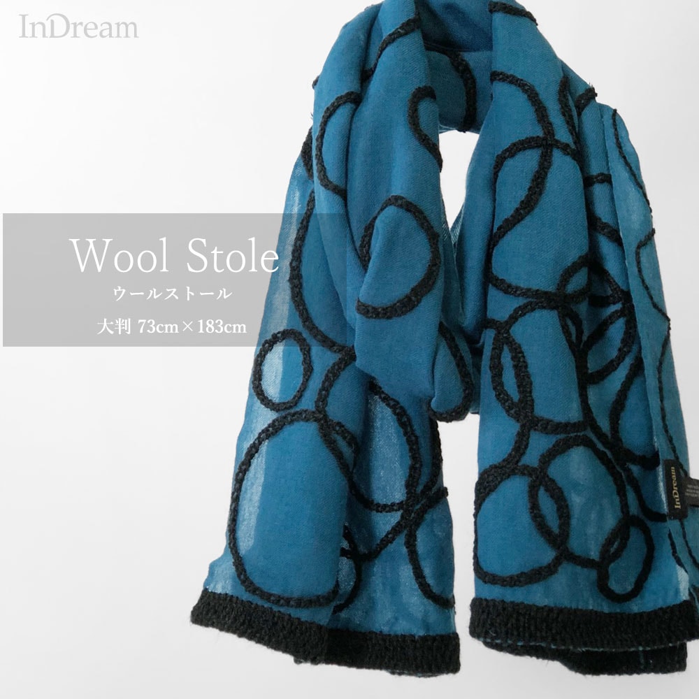 InDream ウールストール インクブルー 白毛糸刺繍 秋冬 カジュアル 春夏 30代 40代 50代 60代