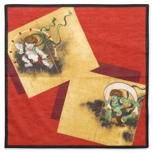 綿ハンカチ 風神雷神 アカ 47.5×47.5cm Fujin & Raijin Handkerchief of a Japan...