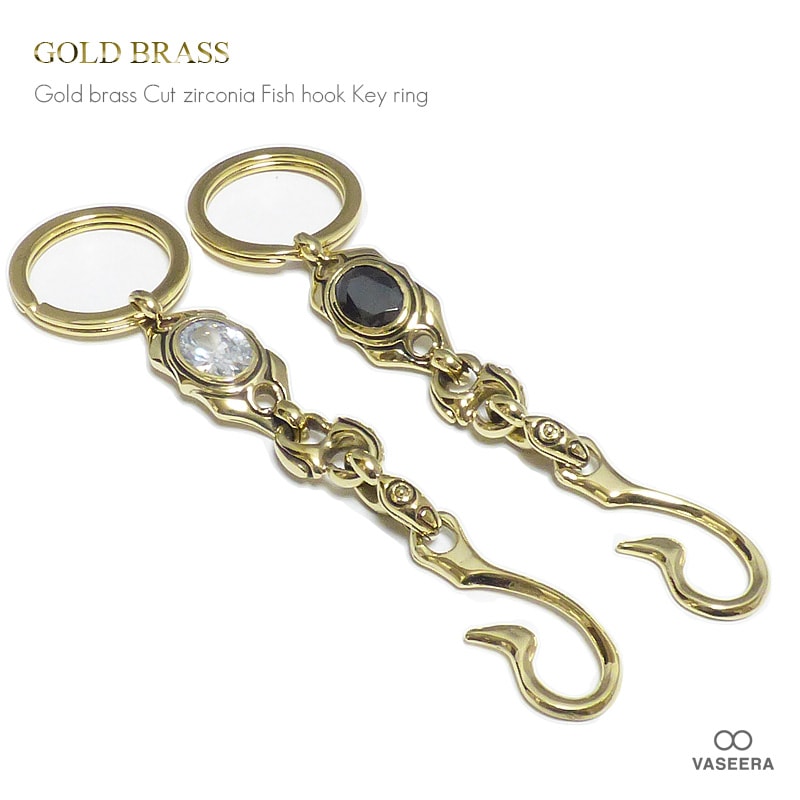 ゴールドブラス(真鍮) カットジルコニア(クリア/ブラック)埋め込み フラット二重リング(平型二重カン)付きキーホルダー 【キーリ...