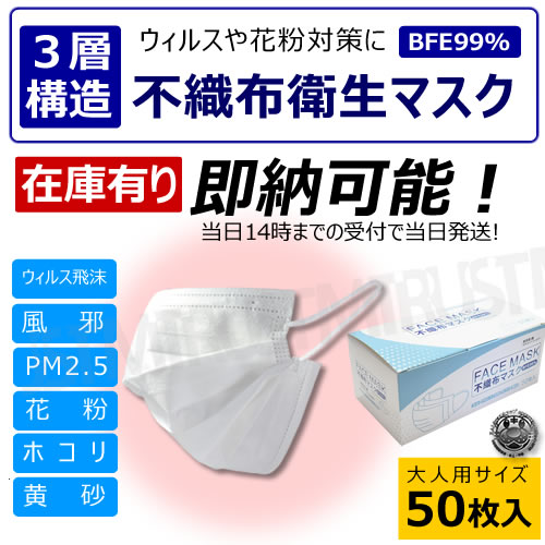 50枚入り 即納 不織布 衛生マスク BFE99% 3層構造 国内発送 使い捨て 大人サイズ 白 飛沫防止 ほこり 風邪 ウイルス...