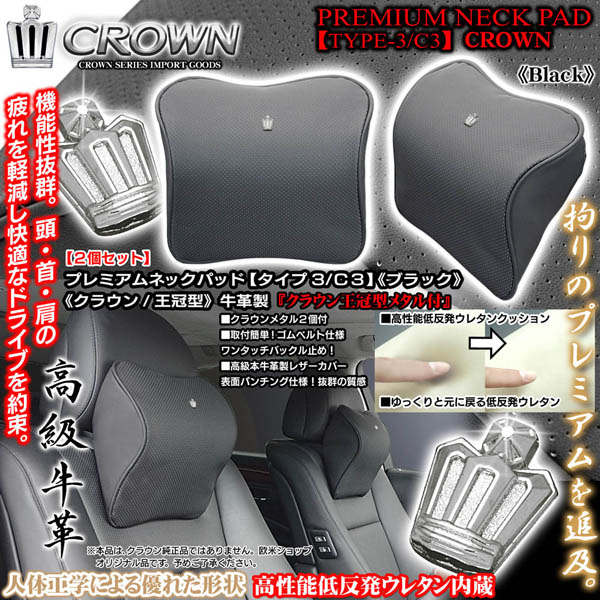 クラウン王冠型ミニメタル付《タイプ3/C3》プレミアムネックパッド【ブラック/2個】低反発ウレタン/本牛革製パンチングレザー/ブラ...
