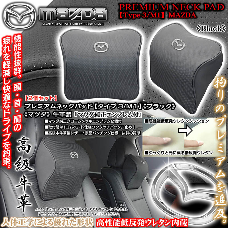 マツダ純正メッキエンブレム付《タイプ3/M1》プレミアムネックパッド【ブラック/2個】低反発ウレタン内蔵/牛革製パンチングレザー/...