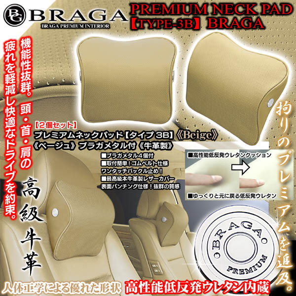 ブラガメタル付《タイプ3B》プレミアムネックパッド【ベージュ/2個セット】低反発ウレタン内蔵/本牛革製パンチングレザー製/ブラガ