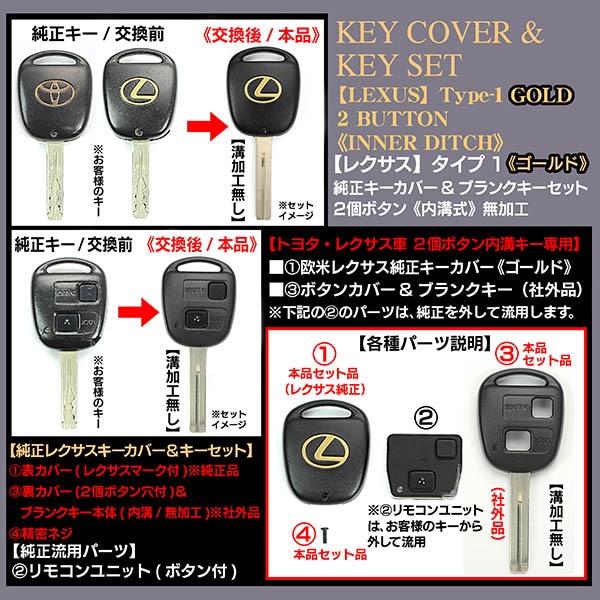 2個ボタン専用【トヨタ車】ゴールド/レクサスLマーク[タイプ1]レクサスキーカバー&キーセット[内溝無加工]ブラガ