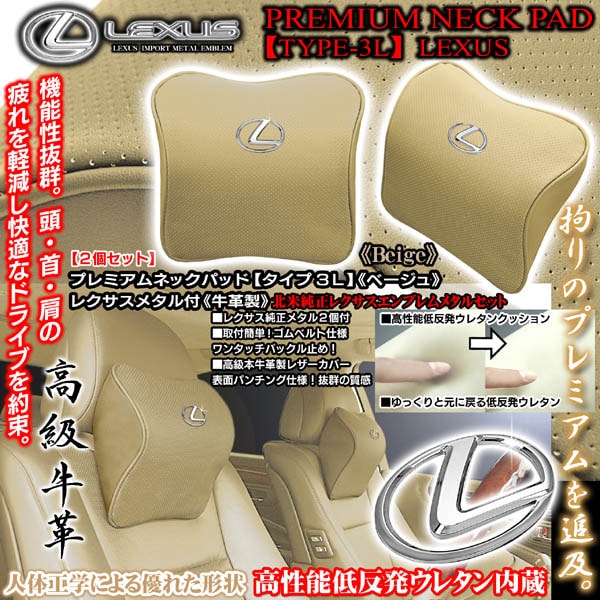 ブラガ製レクサス車用互換品プレミアム ネックパッド/純正レクサスエンブレム付[タイプ3L/ベージュ/2個セット]低反発ウレタン内蔵...