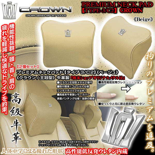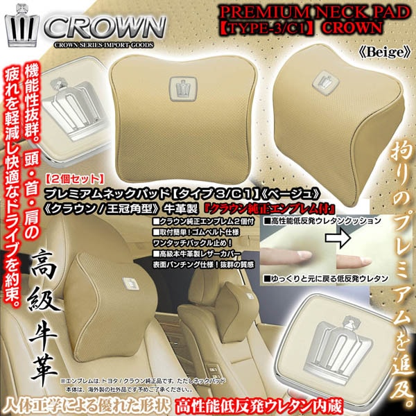 クラウン純正王冠角型エンブレム付《タイプ3/C1》プレミアムネックパッド【ベージュ/2個】低反発ウレタン/本牛革製パンチングレザー...