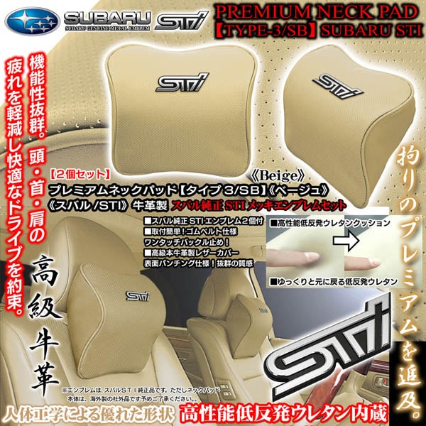 スバル純正STIメタル付《タイプ3/SB》プレミアムネックパッド【ベージュ/2個セット】低反発ウレタン内蔵/本牛革製パンチングレザ...