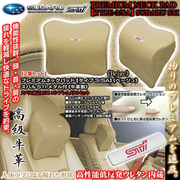スバル純正STIメタル付《タイプ3/SA》プレミアムネックパッド【ベージュ/2個セット】低反発ウレタン内蔵/本牛革製パンチングレザ...