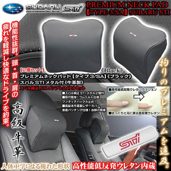 スバル純正STIメタル付《タイプ3/SA》プレミアムネックパッド【ブラック/2個セット】低反発ウレタン内蔵/本牛革製パンチングレザ...