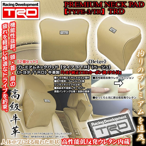純正トヨタTRDメタル付《タイプ3/TR》プレミアムネックパッド【ベージュ/2個セット】低反発ウレタン内蔵/本牛革製パンチングレザ...